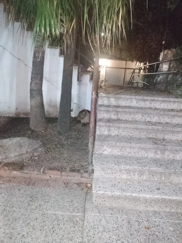 El espécimen es un carpincho, el cual fue divisado mientras circulaba por la calle Alsina. Posteriormente, fue perseguido por un grupo de perros y terminó por refugiarse en el complejo Bianea, debajo de las escaleras que conducen al primer piso.
