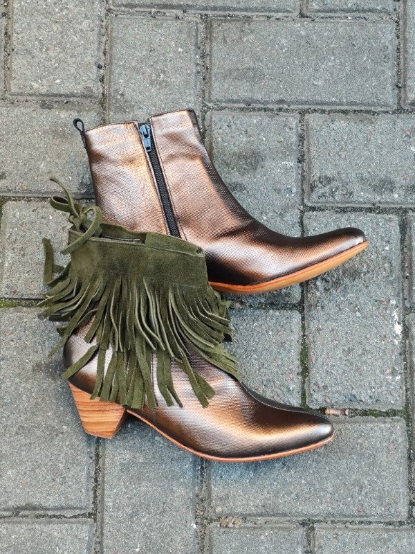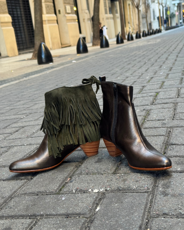 El producto que se colgó los laureles fue la bota «Cordelia». El calzado, de color verde metalizado y grabado, hecha 100% con cuero vacuno y taco de madera, recibió la distinción de la cartera económica. Cordelia se estiliza con un accesorio extra intercambiable: un par de tiras con flecos de gamuzón verde.